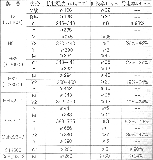 TUI(C1020)、T2(C1100)、T3、H90、H80、H70、H68、H65、H62、HPb59 1,CuFe96-3铜铁合金、AgCu银铜合金、QSi3-1硅青铜、QTe05(C14500);碲铜等。